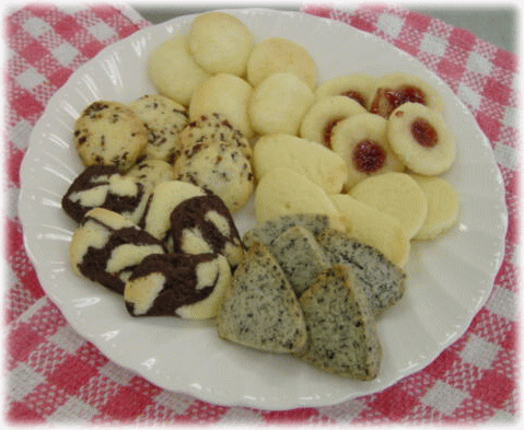 * レーズン入りクッキー 生地に刻んだレーズンを入れ30等分して平らに丸くまとめる。厚さ5mm程度に。 * レモン風味クッキー 生地にレモンのすりおろした皮を入れ、30個に分け丸くまとめ、厚さ5mm程度にして、グラニュー糖を全体的にまぶしておく。 * 苺ジャムクッキー 生地を30等分に丸め、上を少しくぼませ、グラニュー糖をまぶし、くぼませたところに