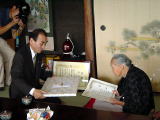 長寿祝いで総理大臣より賞状と記念品を頂いたおばあちゃん。 今日は敬老会で自分の足でこの賞状を頂に行った・・・本当に元気! 長寿の老人が家にいるのは、家族和楽と手紙を書いてきた長男の言葉を思い出したけど、自然いっぱいの環境でストレスのない毎日が長寿の秘訣かな・・・ |