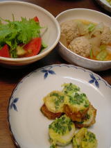 ちくわのマッシュポテト入り卵のピカタ 鶏肉ミンチとダイズの肉団子入りのの野菜スープ 水菜のサラダ 肉団子は栄養たっぷり。ダイズの水煮を小さく刻んで 白葱や生姜、お味噌を入れてよく捏ねおだんごにする。 大根や白菜、人参などと一緒に煮る。彩に絹さやを・・・ 今日のはまったく思いつき! ちくわは、次男が喜んで食べていた。 見た目もかわいい〜。 |