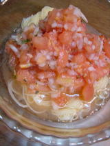 冷製トマトの スパゲッティー カッペリーニと言う麺を使う (別名エンジェルヘヤー)と言うらしい。 確かにそうめんのような細さ |