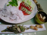 冷風豚しゃぶ(トマト、きゅうり、レタス、絹ごし豆腐、バジル、新玉ねぎ) 山独活の天婦羅、竹輪の天婦羅 ナスとみょうがのお味噌汁 昨日、山独活をもらって帰ってきたので味噌和えにしようか悩みつつ、豚しゃぶがあっさりしているので、天婦羅にしました。 苦味がおいしいし、香りがすごくいいー。 |