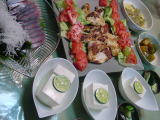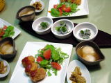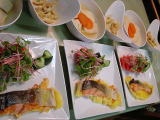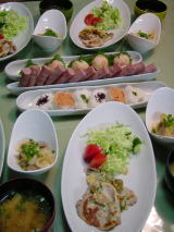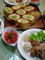 鶏肉の香草焼き、野菜サラダの付け合せ 冷奴 つばすの刺身 ふきの卵とじ 栗かぼちゃ なすときゅうりの浅漬け |