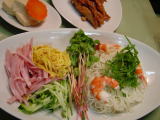 *12日の夕食 暑かったので、冷やしソーメンにしました。 シソの葉たっぷり、そば菜、エビ、キュウリ、ハム、錦糸玉子 鶏ささみのオランダ揚げ 高野豆腐の煮物(昨夜の残り物) |