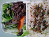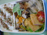 27日お弁当 昨夜ののこりのひりょうずを野菜あんかけにしたもの 牛肉丼風 三つ葉のせ 干し大根とごう天の煮物 トマト フィッシュカツ(これ徳島の名産です) |