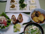 はんぺんとトマトのサラダ 油揚げと卵の包み煮 豚肉とピーマンの炒め物 ポテトサラダ 今日は暑くて腐らないかと心配でした。 |