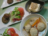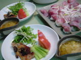 夕食 鶏ミンチとシソの葉、スプラウトの餃子揚げ、レタスとトマト添え (だし醤油につけて頂きます) 山芋スライスとまぐろ等と三つ葉のサラダ風 メカブ 大根のお味噌汁 |