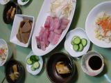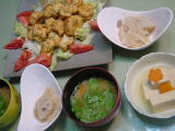 鮭の生クリームと卵のソース、レンジ加熱 トマトとそば菜ときゅうりの付け合せ 山独活とイカの酢味噌和え 高野豆腐の煮物、人参は高野豆腐に入れましたが、2個飾り切りして飽きてしまいあとは、ただの花形です(~_~) |