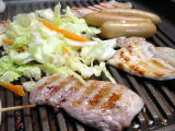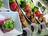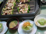 焼き鳥(ホットプレートでまとめて焼きます)鶏肉は、胡麻油、醤油、酒、しょうがなどに漬けておきます マスカットときゅうりのサラダ(フレンチドレッシング) キャベツと平てんの煮物 お味噌汁(白葱の卵とじ) |