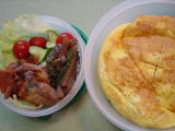 次男のお弁当 巨大オムライス 豚肉の甘辛炒め こんにゃくとししとうの炒め物 野菜サラダ オムライス好物なんで喜んでいました。 私も大好き! |