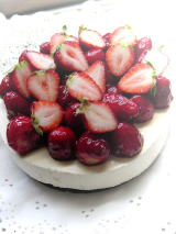 下のチラッと見えている黒い陰は オレオクッキーです。 ラズベリーと苺ジャムとゼラチンで苺をあわせたものをたっぷりかけています。 |