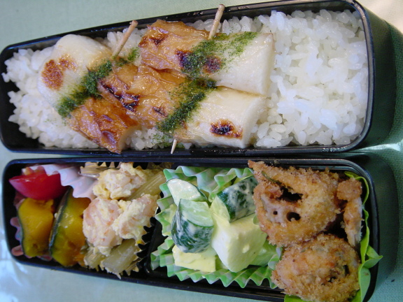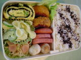 夫が出掛けるまであと15分になって 慌てて作り始めました。ご飯を炊いたり、流しを片付けたり、リボンのマカロニをタッパーに移し変えたりしていると時間の経つのは早く、気が付くと「きゃあー、どうしよう・・・・」 かなり手抜きのお弁当メニューだけど 次男は冷凍ビーフンとかキャベツミンチコロッケはよろこんでいました。 夫はコロッケまずいから1個捨てたと言ってました。 私も食べたけど、美味しくなかったけどおなか空いていたので食べたけどねー。 冷凍の里芋を素揚げにして塩だけでも、結構おいしいのです。 玉子焼きは、ニラと味付け海苔入りです。 |