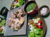 25日夕ご飯 鰆の焼き物 夏大根おろし 焼きなす こんにゃくと京野菜の甘辛ししとう ルッコラとトマトのサラダ しじみのお味噌汁 あの頂き物の魚、絶対鰆と思う。自信はないけど・・・ |