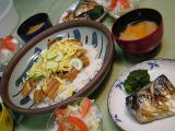 慌てて作った夕食 春巻きの卵包み揚げ、キャベツとトマトの付け合せ ひじきの煮物 秋刀魚の開き 大根おろし セロリ、きゅうり、大根の浅漬け |