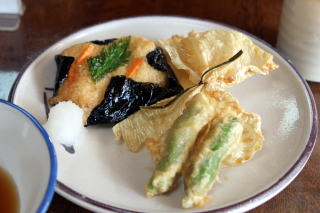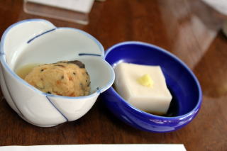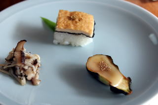 豆腐のお寿司、なすの田楽 椎茸とえのきの酢の物? |