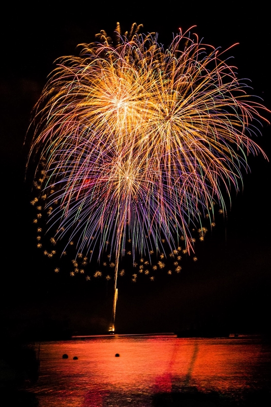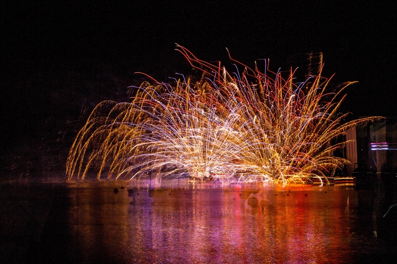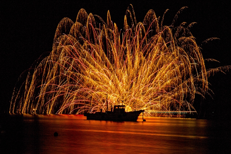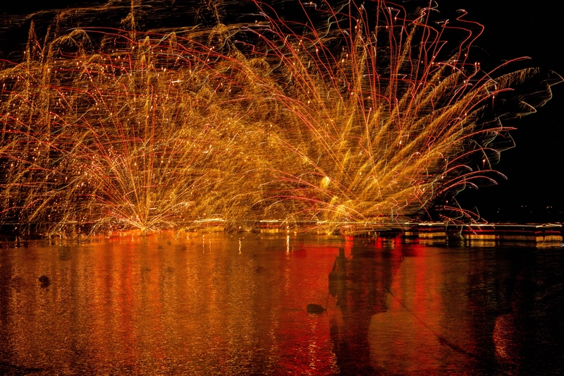 船から花火を水中に投げ込み 船はどんどん移動するので