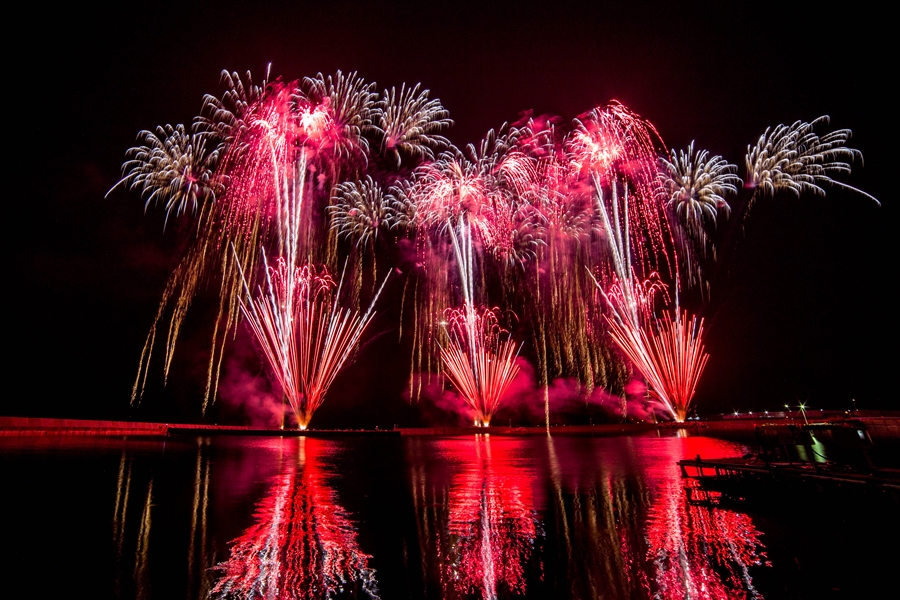 二つの防波堤で仕掛けや打ち上げ花火が楽しめます