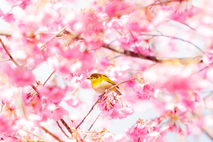 寒緋桜の蜜を求めて 動きの早いメジロを追うのは難しい 今日は 明るい日差し...