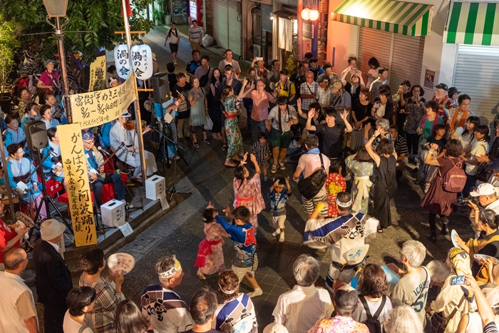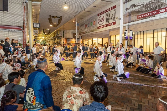 アーケードの中でもいくつも連が輪踊りや流し踊りをしています