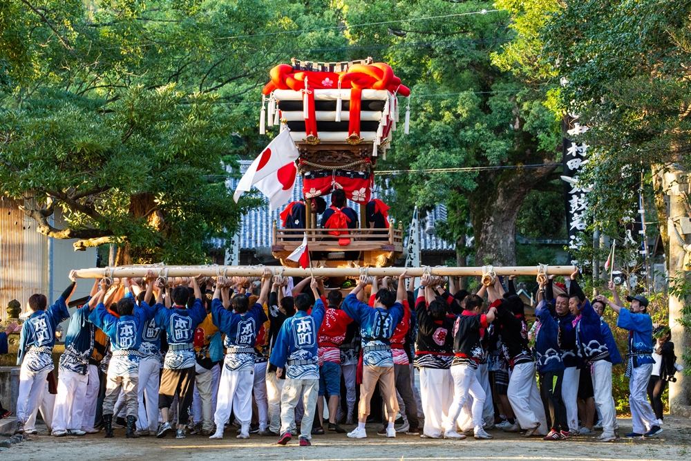 八番太鼓が御旅所に「ちょうさ(太鼓)」を置くと 御神輿がお宮に戻られます 御浜出でと同じ順番で帰宮し 八番太鼓が太鼓納屋に「ちょうさ(太鼓)」を置くと その年のお祭りは終わりとなります