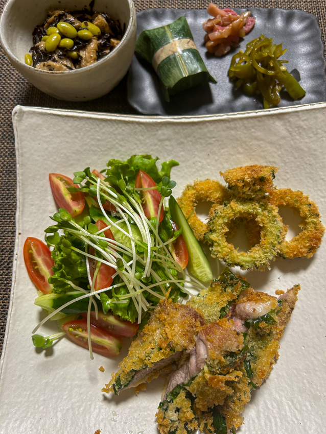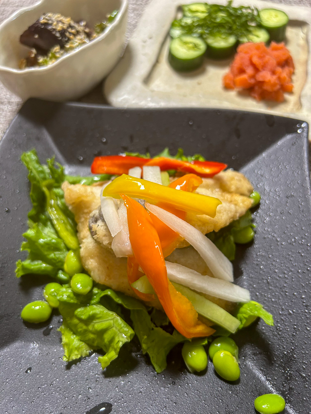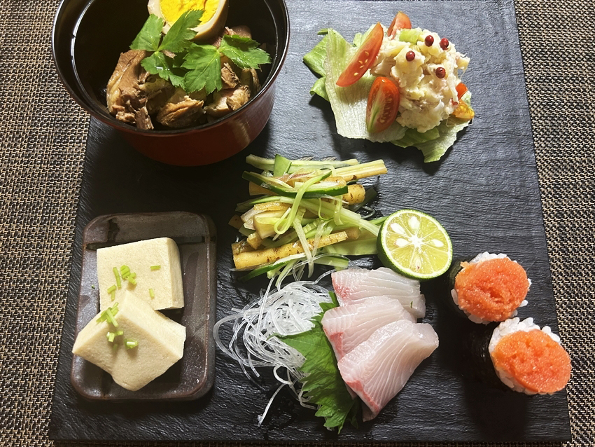 高野豆腐の含め煮 カンパチお刺身 明太子ロール