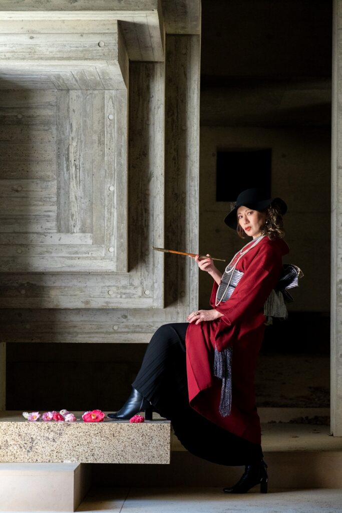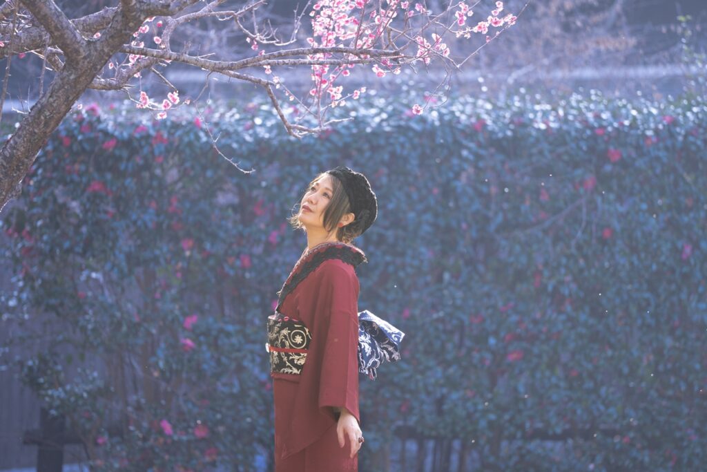 私の指示は 赤い着物 足元はブーツで!