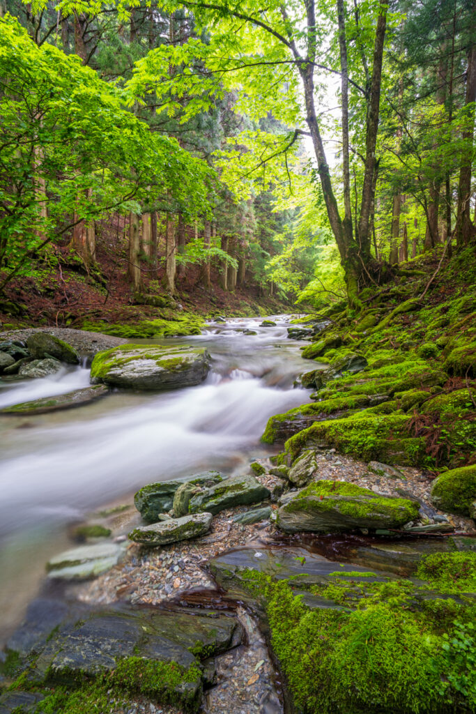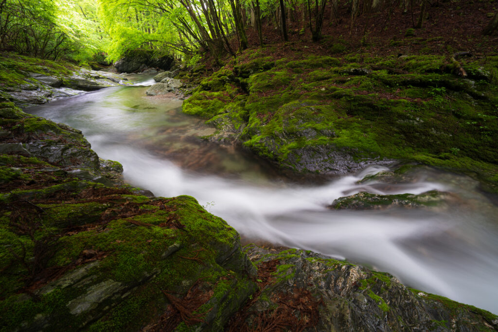 苔むした岩肌と渓流