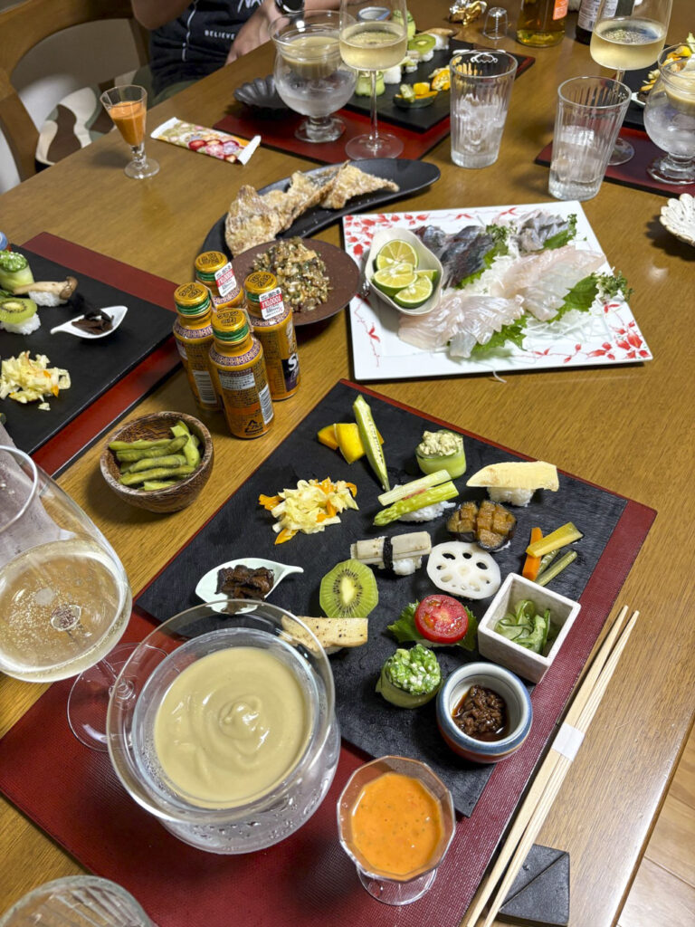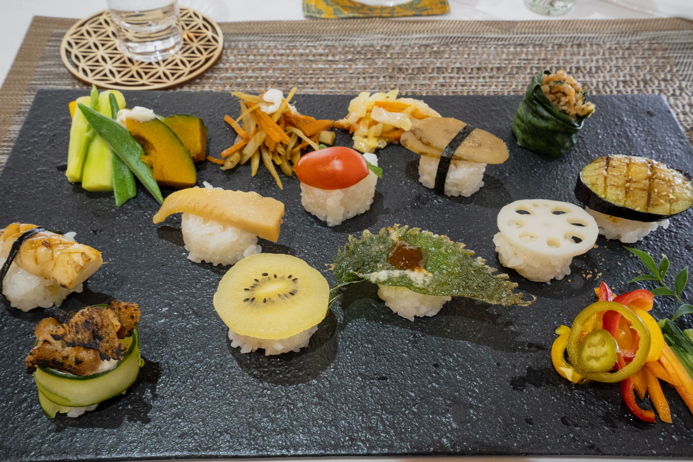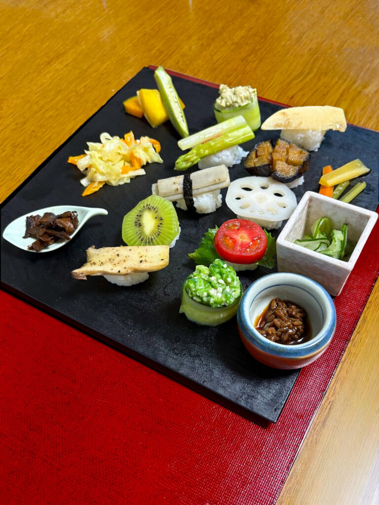 大豆ミートは手に入らなかったのでオクラとアボカドを使って10種類のお寿司を用意